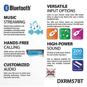 The Dual Electronics DXRM57BT Double DIN Digital Media Car Receiver will make an amazing addition to any vehicle. Its Built-In Bluetooth Wireless Technology provides you with Hands Free calling and music-streaming capabilities when you need it. Our engineers designed this unit to ensure that there would be a seamless pairing between your Bluetooth device(s) and the DXRM57BT Digital Media Bluetooth Car Stereo Receiver, allowing you to answer calls, redial or manage your call waiting directly from your car’s receiver using the built-in microphone. With this additional technology, you can also pair your car audio to music apps such as Pandora, iHeartRadio & Spotify wirelessly, listen to all your favorite songs on your Apple, Android, and other media devices in addition to the ones stored on your MP player. The 7 Character High Resolution Liquid-Crystal Display (LCD) allows for easy visibility and will allow you to comfortably manage your favorite options all within fingers reach. The DXRM57BT Car Stereo Receiver has 4 EQ Curve Presets (Pop, Jazz, Rock, and Flat) and 2 Band Tone Control (Bass/Treble) included in order to elevate your listening experience and designed to maximize sound quality. In addition, this car stereo receiver has a USB input with 1 Amp charging power for user convenience, an AUX port for maximum media device compatibility, and 30 AM/FM station presets to provide you with a wide selection of radio content to enjoy. The DXRM57BT Digital Media Car Stereo receiver generates 200 Watts of Peak Power (50W x 4). Product Features: BLUETOOTH WIRELESS TECHNOLOGY – your Double DIN car stereo receiver will effortlessly pair and store the vast majority of Bluetooth devices providing you with Hands Free Calling and Music Streaming capabilities MUSIC STREAMING – you will now be able to stream music from apps such as Pandora, iHeartRadio, Spotify and much more from your Apple, Android or Media devices including any music stored by simply connecting wirelessly to your car stereo LCD HIGH RESOLUTION 7 CHARACTER DISPLAY – your high resolution LCD 7 character display allows easy visibility while driving and keeps all your favorite options within fingers reach USB AND MP3 PLAYBACK – you now have a variety of options in which to listen to all your favorite songs via USB port and MP3 player as well as through 30 different AM/FM radio stations PRESET EQ CURVES – the Dual Electronics DXRM57BT Receiver comes with 4 EQ Presets as well as 2 Band Tone Control for maximum customization for your listening pleasure.