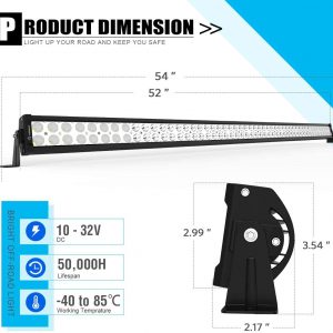 COMBO BEAM DESIGN: The combination of two 60-degree flood beam and one 30-degree spot beam of the 52 inch led light bar makes it lighter and wider to give you an incredibly clear visibility in any terrains, which helps avoid potential hazards on the road ahead.